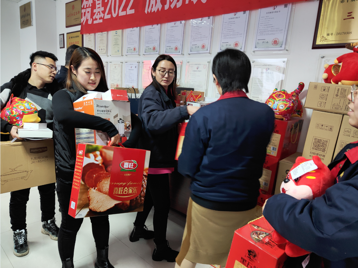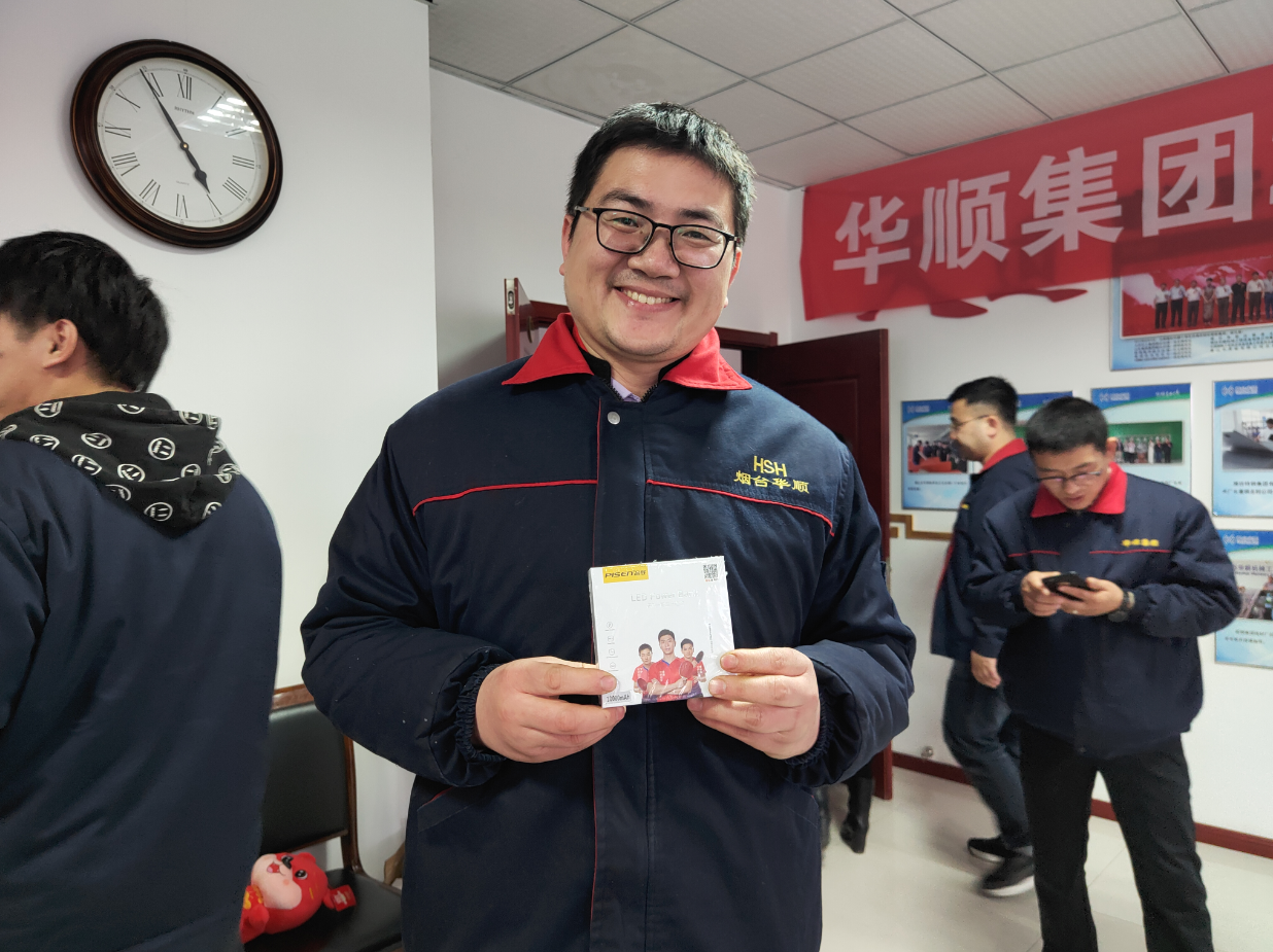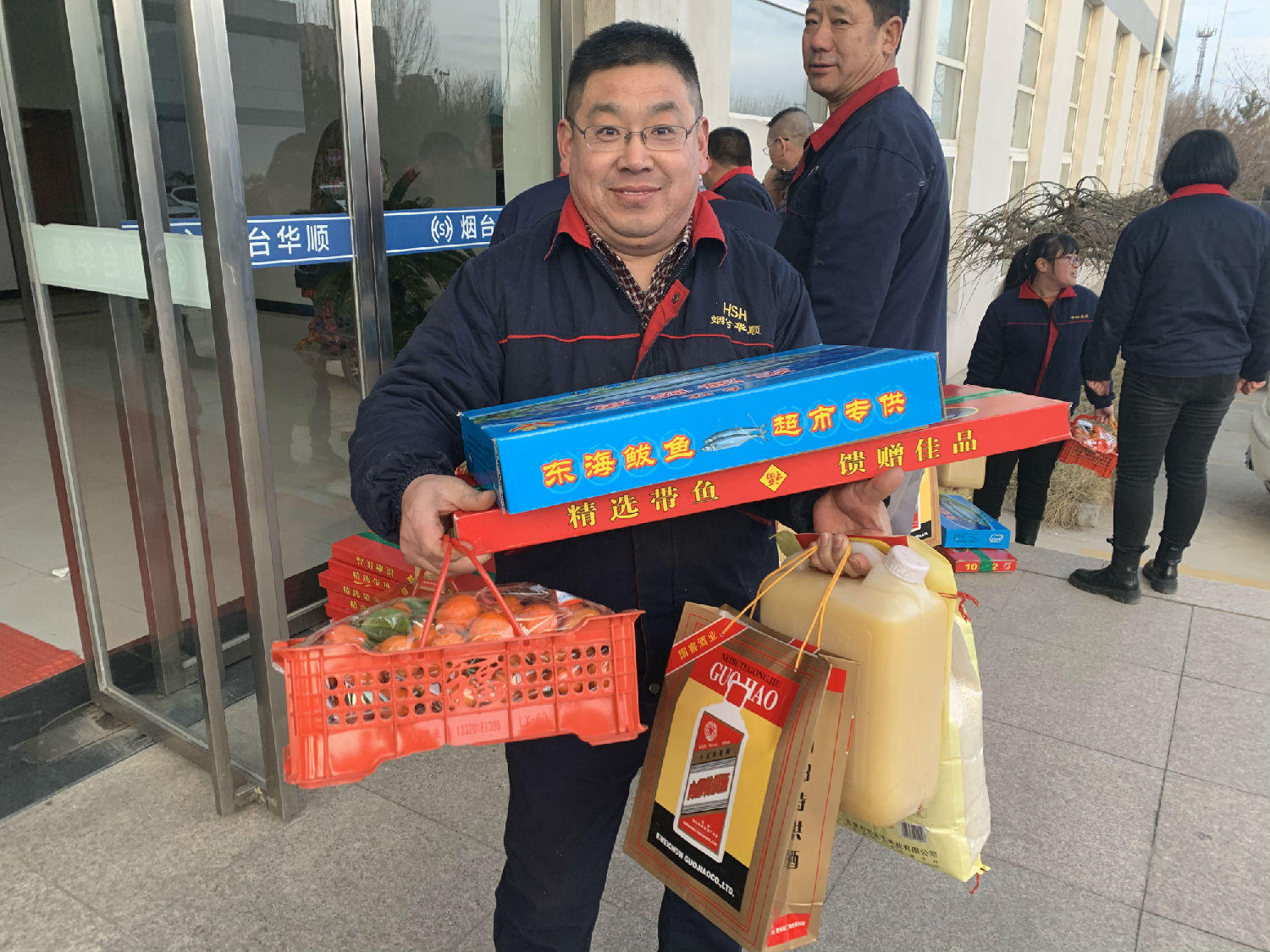 精彩的節(jié)目看完后,別忘了拿年貨哦,在歡聲笑語中,豐厚的年貨也一一到了華順每一位家人的手中。