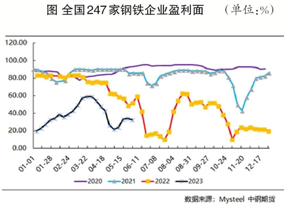 在此之后,停產(chǎn)檢修情況蔓延至全國多地的鋼廠。但此情況維持時(shí)間不久,隨著利潤的小幅改善,此前停產(chǎn)減產(chǎn)的鋼廠便陸續(xù)復(fù)產(chǎn)。截至6月2日當(dāng)周(5月27日—6月2日),全國247家鋼廠盈利面為32.9%,比一個(gè)月前的5月5日當(dāng)周(5月1日—5日)擴(kuò)大近11個(gè)百分點(diǎn)。截至6月1日當(dāng)周(5月25日—31日),螺紋鋼產(chǎn)量為273.41萬噸,環(huán)比上升3.03萬噸,同比下降24.21萬噸;熱軋卷板產(chǎn)量為310.06萬噸,環(huán)比下降5.25萬噸,同比下降4.98萬噸。螺紋鋼周產(chǎn)量低于過去5年的同期水平,但已連續(xù)2周回升,有繼續(xù)上升趨勢。